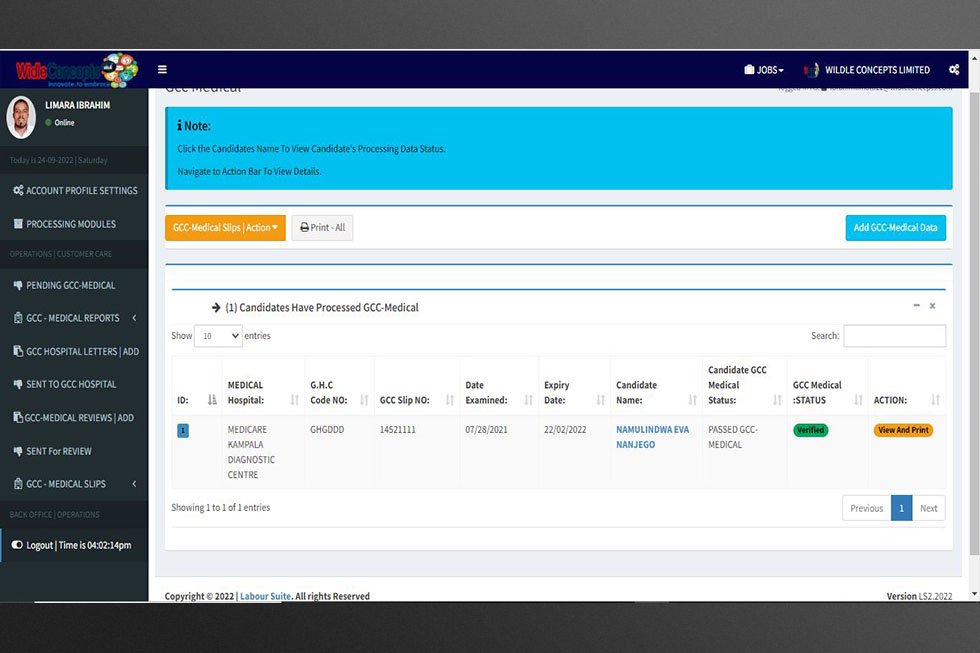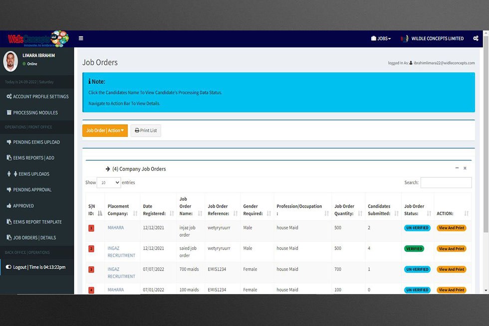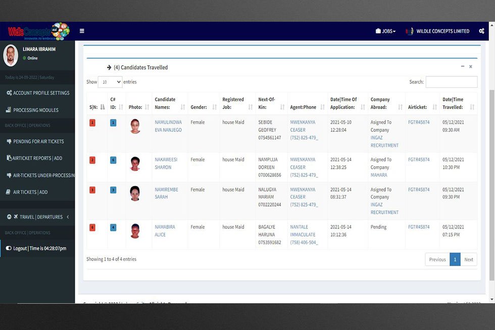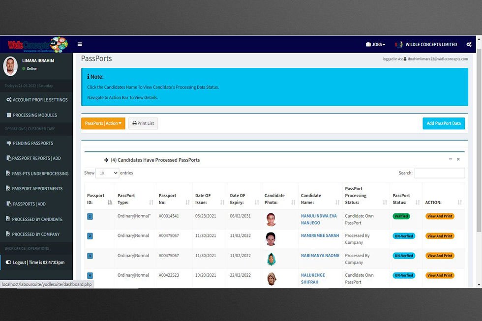 The Staff- Module avails users the capability to register new Candidates who wish to go work abroad, manage and easily retrieve bio-data for existing Candidates, manage Passports, Interpol, Yellow-Book Data for Candidates. Through this module Staff-Accounts are able to record and save data, To also print and